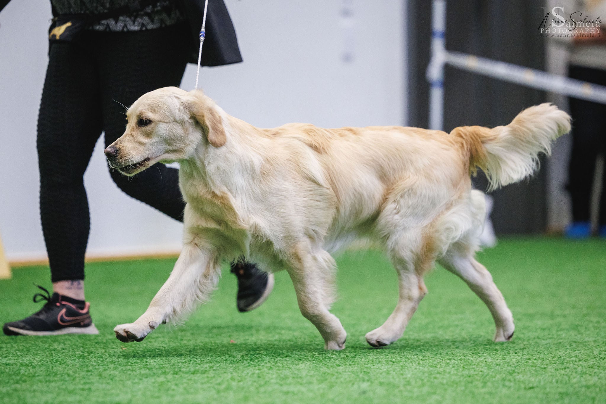 3-vuotias. Hyvä koko. Vahva luusto. Oikea pään malli. Luminenä. Löysää kaulanalusnahkaa. Hyvä kaula, säkä ja ylälinja. Hyvä eturinta, runko. Turhan pitkä lanne. Hyvin kulmautunut takaa. Liikkeessä pystyi häntä ja löysyyttä etuliikkeissä. turkin väri vaihtuu keltaisesta harmaaseen.