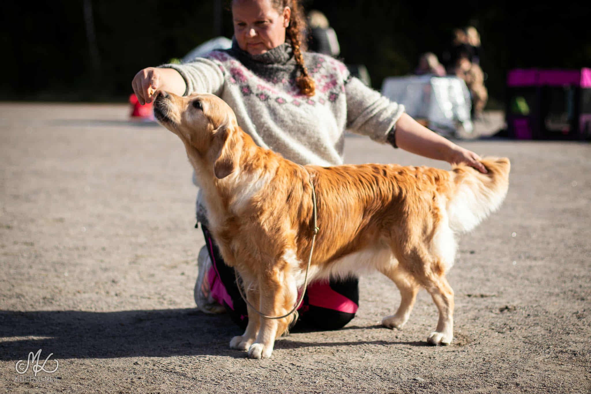 3-vuotias. Hyvä koko. Vahva luusto. Oikea pään malli. Luminenä. Löysää kaulanalusnahkaa. Hyvä kaula, säkä ja ylälinja. Hyvä eturinta, runko. Turhan pitkä lanne. Hyvin kulmautunut takaa. Liikkeessä pystyi häntä ja löysyyttä etuliikkeissä. turkin väri vaihtuu keltaisesta harmaaseen.